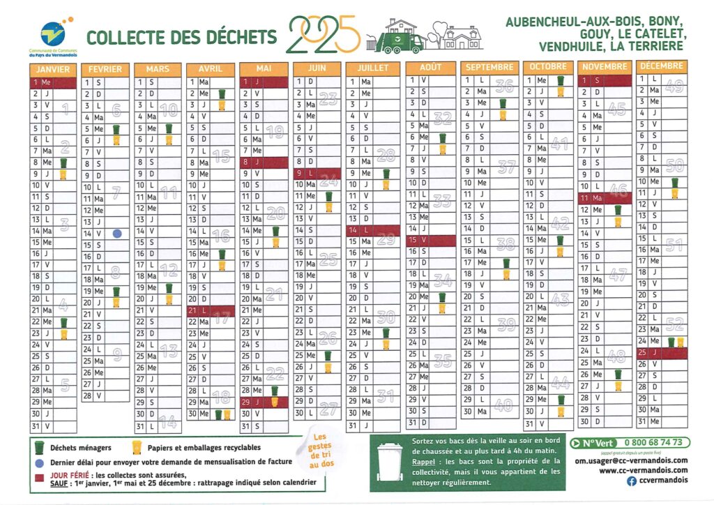 Les déchets sont collectés par la Communauté de Communes du Vermandois. Les collectes ont lieu le mercredi matin pour les ordures ménagères et le jeudi matin pour les déchets recyclables une semaine sur deux. Retrouvez également ci-dessous les horaires des déchèteries de la Communauté de Communes du Vermandois.
